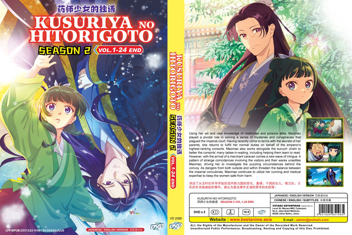Using her wit and vast knowledge of medicines and poisons alike, Maomao played a pivotal role in solving a series of mysteries and conspiracies that plagued the imperial court. Having recently come to terms with the secrets of her parents, she returns to fulfill her normal duties on behalf of the emperor’s highest-ranking consorts. Maomao also works alongside the eunuch Jinshi to better the consorts’ many ladies-in-waiting, including helping them learn to read. However, with the arrival of a merchant caravan comes a new wave of intrigue. A pattern of strange coincidences involving the visitors and their wares unsettles Maomao, driving her to investigate the puzzling circumstances behind the convoy. As dangers from both outside and within threaten the balance between the imperial concubines, Maomao continues to utilize her cunning and medical expertise to keep the women safe from harm.